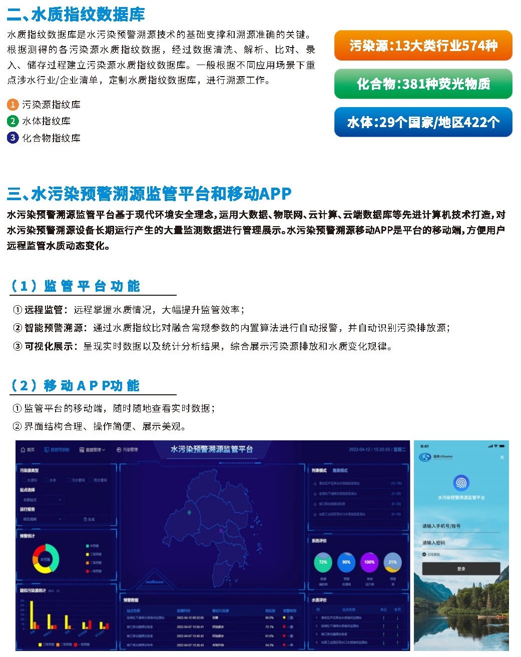 國內(nèi)外首創(chuàng)的水質(zhì)指紋污染溯源技術(shù)核心產(chǎn)品包括系列水污染預(yù)警溯源儀、水質(zhì)指紋數(shù)據(jù)庫、水污染預(yù)警溯源監(jiān)管平臺。利用系列水污染預(yù)警溯源儀進行水質(zhì)指紋測定,應(yīng)用高速智能數(shù)據(jù)分析運算軟件進行指紋數(shù)據(jù)分析,通過與水質(zhì)指紋數(shù)據(jù)庫進行指紋比對,快速鎖定污染排放源。