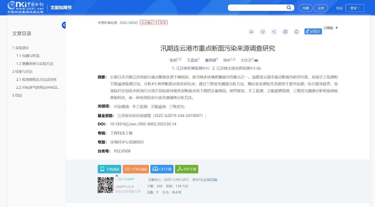 臨汛期水質(zhì)下降問題已經(jīng)成為當(dāng)前我國水環(huán)境質(zhì)量提升的主要難點。2020年7月,江蘇省環(huán)境監(jiān)測中心在連云港市典型汛期超標(biāo)斷面區(qū)域開展溯源調(diào)查研究工作,采用“衛(wèi)星遙感+水質(zhì)指紋溯源”等技術(shù),并結(jié)合現(xiàn)場核查。水質(zhì)指紋溯源結(jié)果顯示,農(nóng)業(yè)源和生活源是導(dǎo)致汛期水質(zhì)下降的主要污染源。這次實踐再次證明了水質(zhì)指紋溯源技術(shù)的有效性和準(zhǔn)確性。具體研究內(nèi)容和成果可見中文核心期刊《中國環(huán)境監(jiān)測》2022年4月第38卷第2期《汛期連云港市重點斷面污染來源調(diào)查研究》一文。