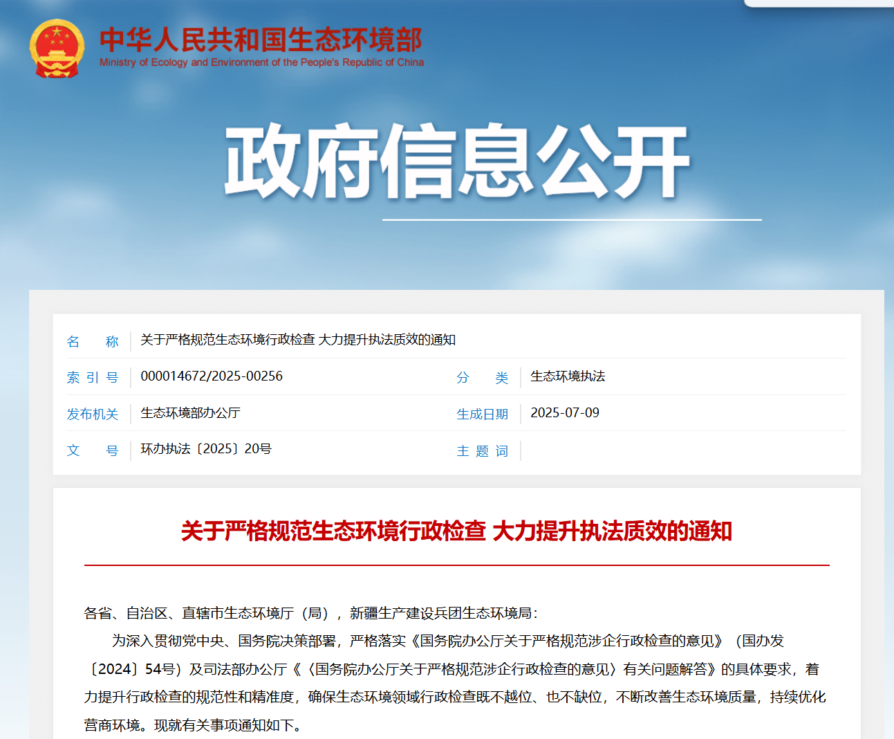 近日,生態(tài)環(huán)境部印發(fā)《關(guān)于嚴格規(guī)范生態(tài)環(huán)境行政檢查 大力提升執(zhí)法質(zhì)效的通知》(環(huán)辦執(zhí)法〔2025〕20號),就生態(tài)環(huán)境領(lǐng)域行政檢查工作作出全面規(guī)范。